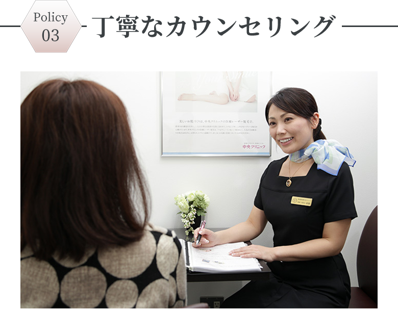 知識豊富な美容カウンセラーが、ご希望、ご要望に添えるように患者様お一人お一人に時間を掛けてカウンセリングいたします。